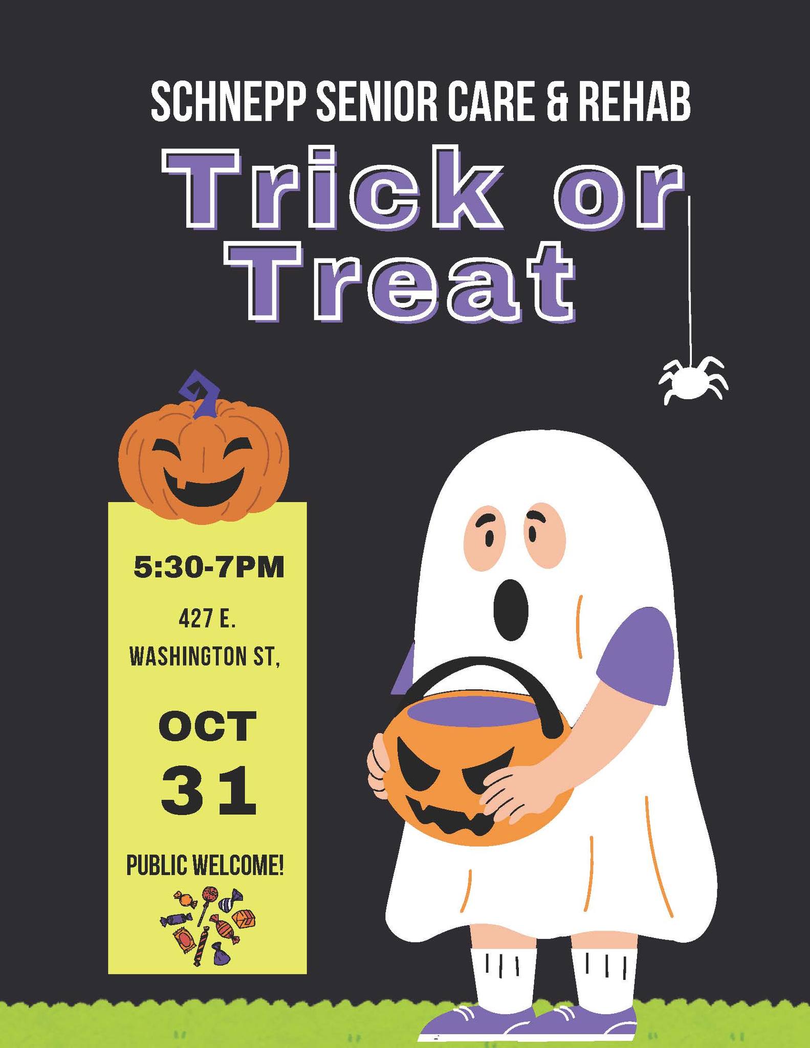 Schnepp Senior Care & Rehab located at 427 E. Washington Street (M-46) in St. Louis will host a Trick-or-Treat event from 5:30 to 7:30 p.m. on October 31. The public is welcome!