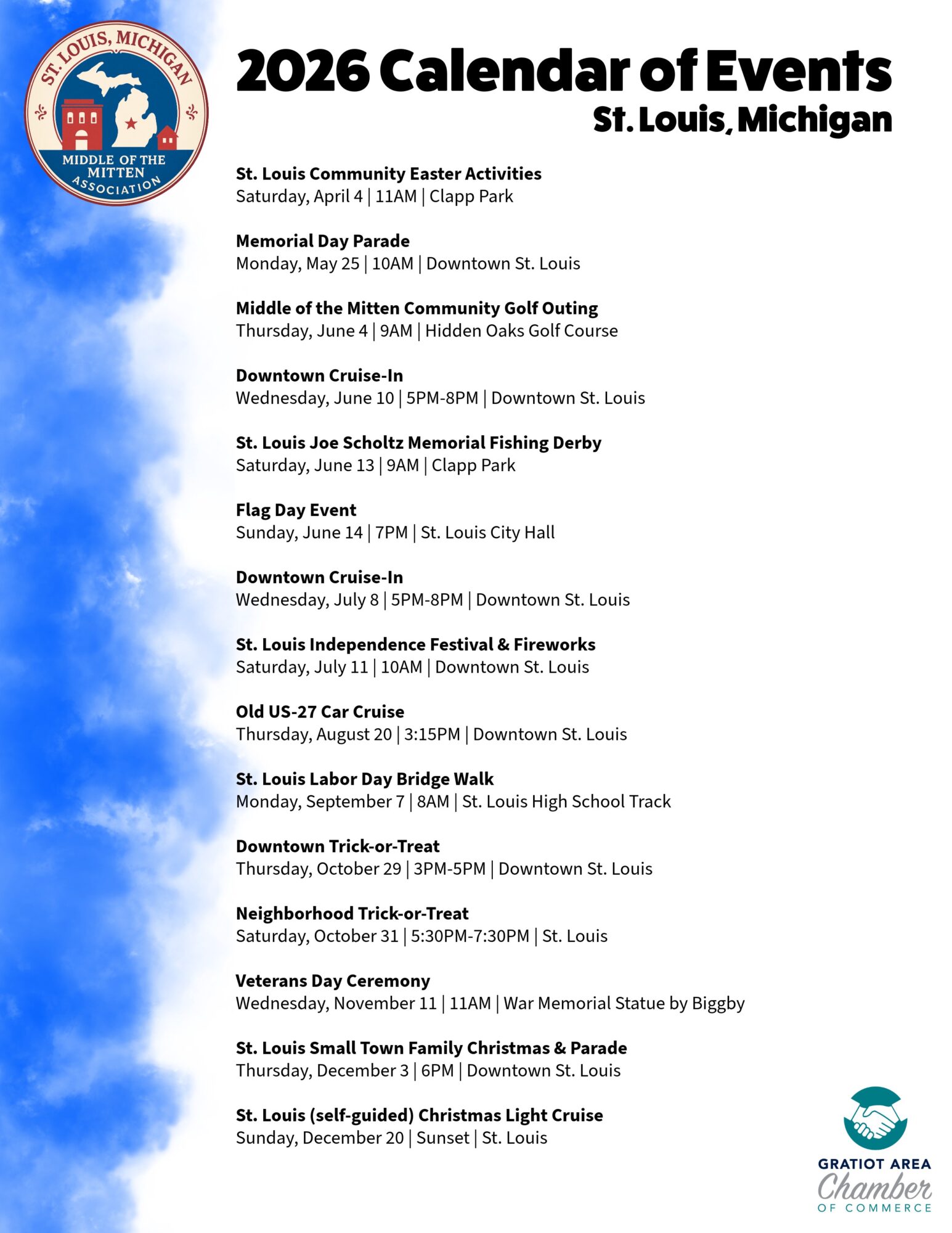 2026 2024 MDOT Events Brochure PDFs/Applications pdf MDOT brochure pdf Fishing Derby Registration pdf Golf Outing Registration Upcoming Events Neighborhood Light Cruise Sunday, December 21 Read Event Details Gratiot County Veterans Breakfast Saturday, January 3 @ 9:00 am - 10:30 am Read Event Details Gratiot County Veterans Breakfast Saturday, February 7 @ 9:00 am - 10:30 am Read Event Details Gratiot County Veterans Breakfast Saturday, March 7 @ 9:00 am - 10:30 am Read Event Details Gratiot County Veterans Breakfast Saturday, April 4 @ 9:00 am - 10:30 am Read Event Details Community Easter Activities Saturday, April 4 @ 11:00 am Read Event Details Gratiot County Veterans Breakfast Saturday, May 2 @ 9:00 am - 10:30 am Read Event Details Memorial Day Parade Monday, May 25 @ 10:00 am Read Event Details Middle of the Mitten Golf Outing Thursday, June 4 @ 9:00 am Read Event Details Gratiot County Veterans Breakfast Saturday, June 6 @ 9:00 am - 10:30 am Read Event Details Classic Car Cruise-In Wednesday, June 10 @ 5:00 pm - 8:00 pm Read Event Details Joe Scholtz Memorial Free Fishing Derby Saturday, June 13 @ 9:00 am Read Event Details